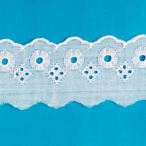 Bordado inglês CTB 134 com 13,7m Branco. O bordado inglês é famoso por ser utilizados por artesãs e costureiras durante acabamentos em peças de roupas, toalhas, pano de prato e copa. ele é indicado para decorar toalhas, fraldas, peças de roupas, patchwork e acabamentos em geral.