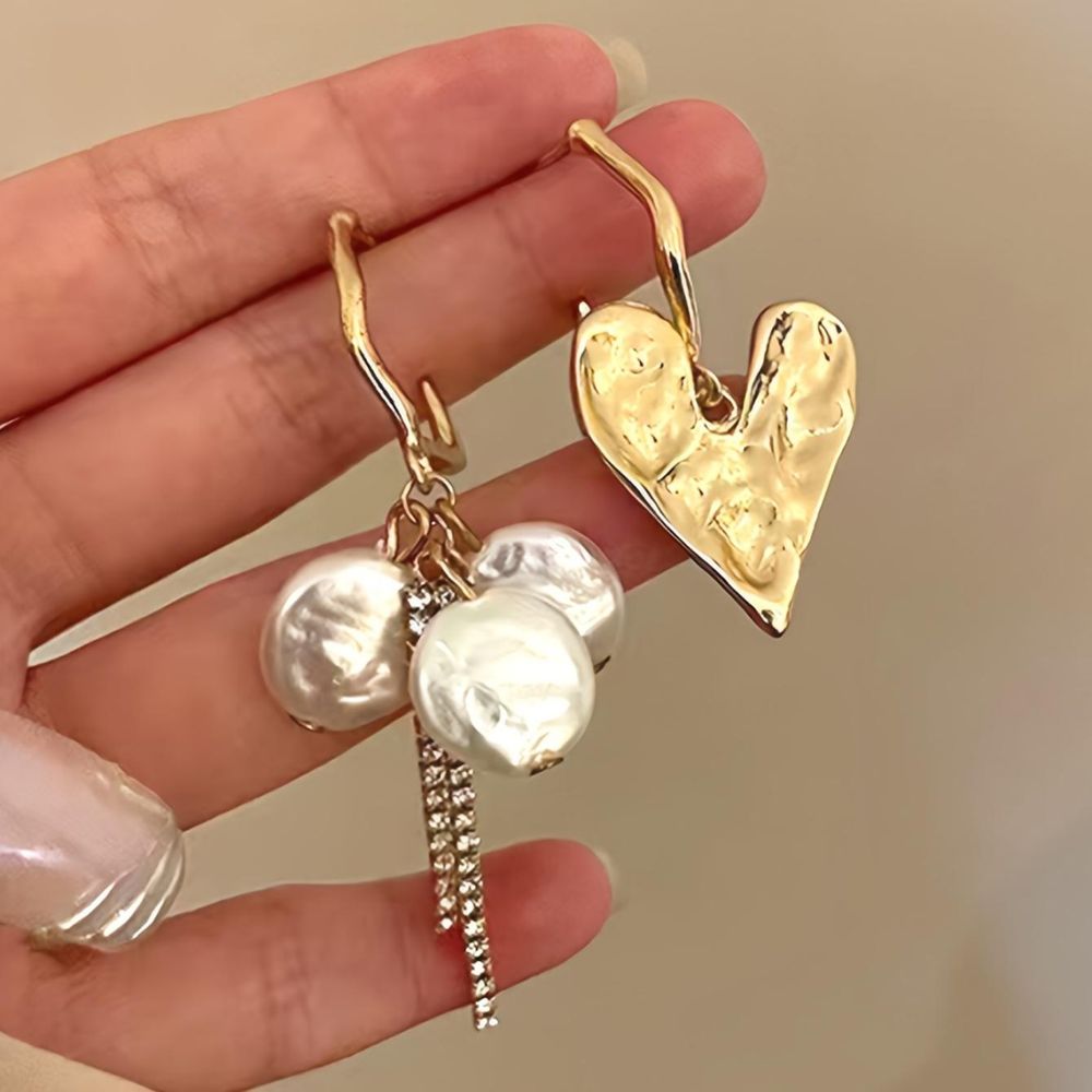 Brincos Assimétricos Únicos em Forma de Coração com Pérolas Falsas dourado