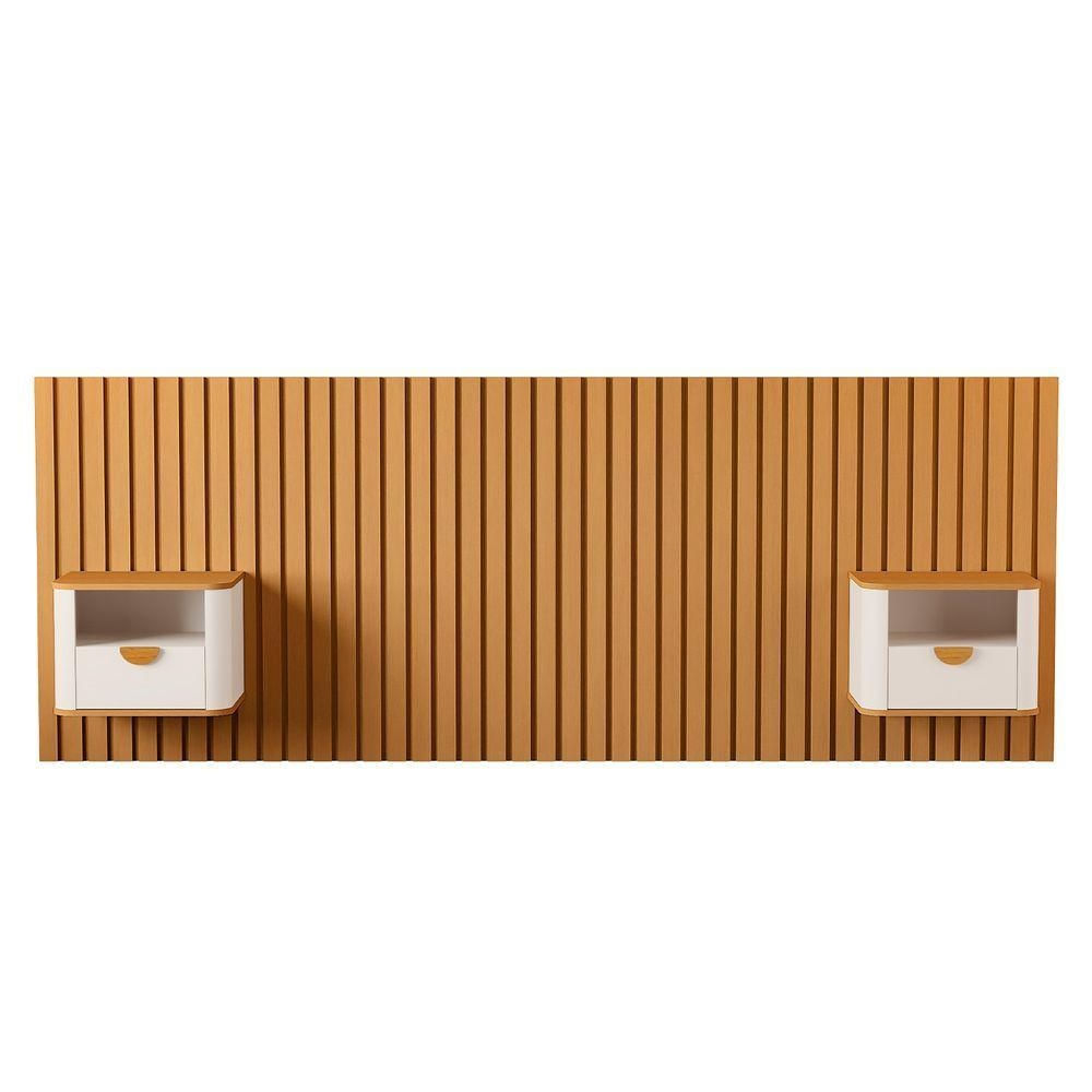 A Cabeceira Ripada Maraca Casal/Queen com 2 Mesas de Cabeceira Suspensas JB Buriti é a combinação perfeita de design moderno e funcionalidade. Ideal para camas de casal ou queen size, seu painel ripado em MDF traz um visual elegante e acolhedor ao ambiente, destacando a parede com sofisticação. O grande diferencial do conjunto são as duas mesas de cabeceira suspensas modelo Buriti, que oferecem praticidade com visual leve e contemporâneo. Com gaveta embutida e tampo funcional, são perfeitas para manter os objetos do dia a dia sempre à mão, sem comprometer o espaço ao redor da cama.Dimensões:Altura : 105 cm Largura : 267 cm Profundidade: 37cmObservações:- Produzida 100% em MDF, com acabamento de alto padrão - Painel ripado moderno e elegante, ideal para camas casal ou queen - Acompanha 2 mesas de cabeceira suspensas modelo Buriti - Mesas com gaveta e tampo funcional, fixadas diretamente no painel - Design suspenso que facilita a limpeza e amplia o espaço visual - Instalação simples com fixação direta na parede