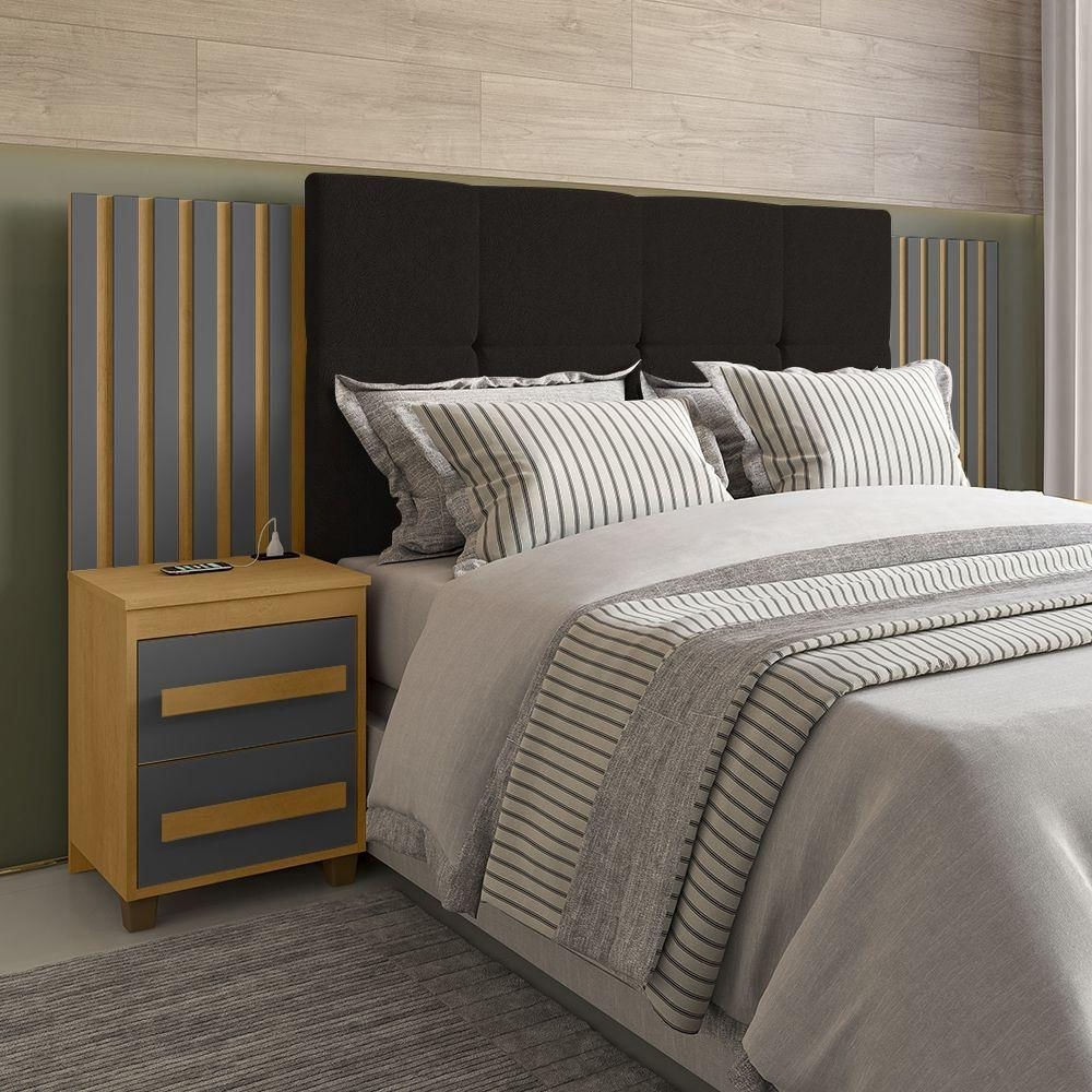 Cabeceira Suíça Extensível Ripado C/ 2 Mesas De Cabeceira Painel Estofado - Cinamomo/grafite