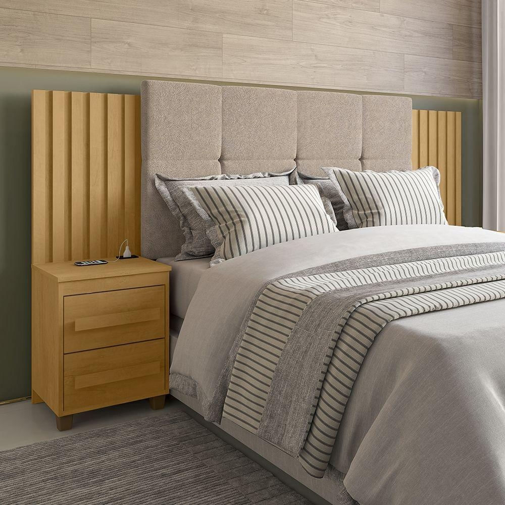 Cabeceira Suíça Extensível Ripado C/ 2 Mesas De Cabeceira Painel Estofado P/ Box - Cinamomo/pena