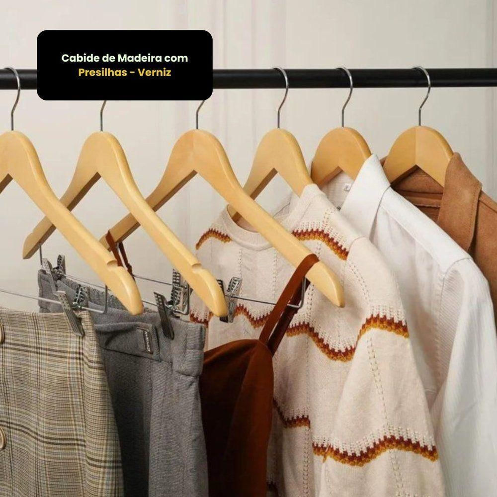 Cabide de Madeira com Presilhas - Funcionalidade e Sofisticação!Fabricado em madeira de alta qualidade com acabamento envernizadoSuperfície lisa e elegante que evita lascas e protege contra umidadeProlonga a vida útil das suas peças favoritasGancho metálico cromado que gira 360°, facilitando o uso em qualquer direçãoSuporta uma variedade de roupas: casacos, blazers, camisas, vestidos e calçasO Cabide de Madeira com Presilhas é a solução ideal para quem busca organização e estilo no armário. Mantenha suas roupas sempre bem cuidadas e à mão!Especificações:Material: Madeira e MetalDimensões:Comp: 44cm x Alt: 24cmConteúdo:01 Cabide de Madeira com Presilhas - Verniz Cabide de Madeira com Presilhas - Funcionalidade e Sofisticação!Fabricado em madeira de alta qualidade com acabamento envernizadoSuperfície lisa e elegante que evita lascas e protege contra umidadeProlonga a vida útil das suas peças favoritasGancho metálico cromado que gira 360°, facilitando o uso em qualquer direçãoSuporta uma variedade de roupas: casacos, blazers, camisas, vestidos e calçasO Cabide de Madeira com Presilhas é a solução ideal para quem busca organização e estilo no armário. Mantenha suas roupas sempre bem cuidadas e à mão!Especificações:Material: Madeira e MetalDimensões:Comp: 44cm x Alt: 24cmConteúdo:01 Cabide de Madeira com Presilhas - Verniz
