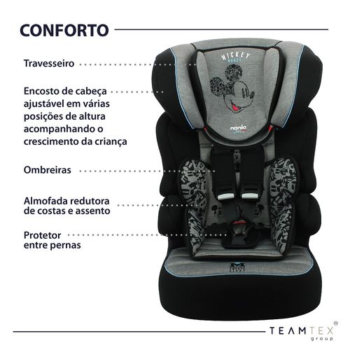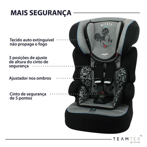 No grupo 1 (de 9kg a 18kg) deve ser fixada ao veículo com o cinto de segurança do veículo e a criança deve utilizar o cinto de segurança da própria cadeirinha. No Grupo 2 e 3 (de 15 a 36kg) deve ser utilizada sem os seus cintos de segurança e o cinto de segurança do veículo deve prender a criança e a cadeirinha ao mesmo tempo. Desenvolvida com tecido auto extinguível (não propaga o fogo).