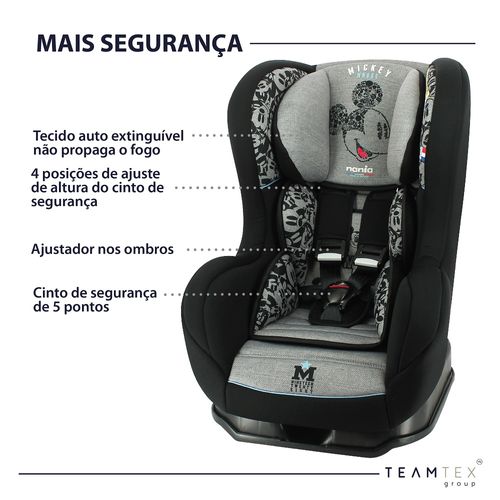 A cadeira conta ainda com uma posição (mais reclinada) de costas para o movimento e 4 posições de frente para o movimento. No grupo 0/1 (do nascimento a 18kg) deve ser fixada ao veículo com o cinto de segurança do veículo e a criança deve utilizar o cinto de segurança da própria cadeirinha. No Grupo 2 (de 15 a 25kg) deve ser utilizada sem os seus cintos de segurança e o cinto de segurança do veículo deve prender a criança e a cadeirinha ao mesmo tempo. Desenvolvida com tecido auto extinguível (não propaga o fogo).