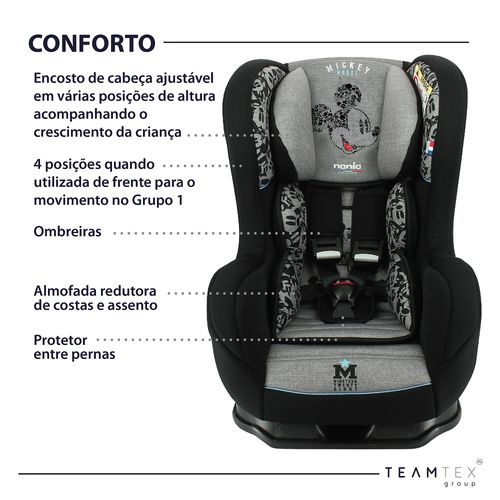 Possui ombreiras, almofada redutora de costas e assento, capa protetora da fivela, encosto de cabeça ajustável em várias posições, fundo protetor da base, além de cinto de segurança de 5 pontos, ajustador do cinto de segurança nos ombros e 4 posições de ajuste de altura do cinto de segurança.