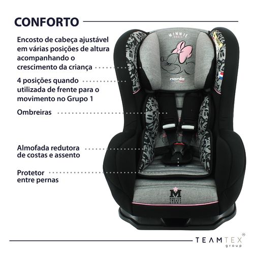 A cadeira conta ainda com uma posição (mais reclinada) de costas para o movimento e 4 posições de frente para o movimento. No grupo 0/1 (do nascimento a 18kg) deve ser fixada ao veículo com o cinto de segurança do veículo e a criança deve utilizar o cinto de segurança da própria cadeirinha. No Grupo 2 (de 15 a 25kg) deve ser utilizada sem os seus cintos de segurança e o cinto de segurança do veículo deve prender a criança e a cadeirinha ao mesmo tempo. Desenvolvida com tecido auto extinguível (não propaga o fogo).