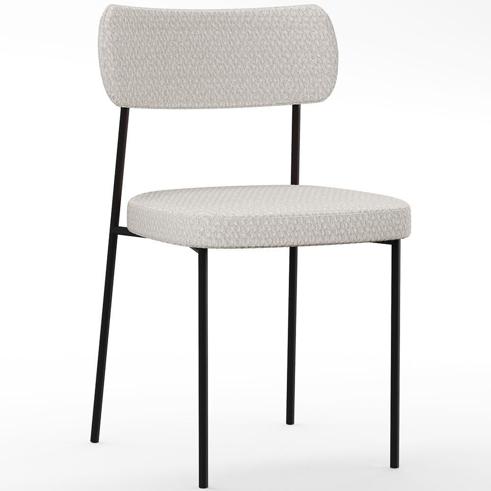 Encosto e assento estofados com espuma laminada. Estrutura fixa em aço carbono com pintura epóxi na cor preto. Revestimento em Bouclê na cor Cru. Peso suportado: Até 120 kg.- Por se tratar de estofado as medidas podem ter uma pequena variação de até 3 cm.