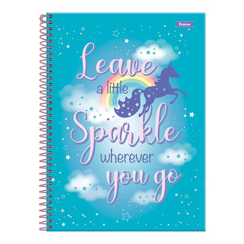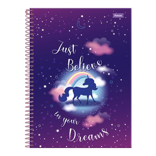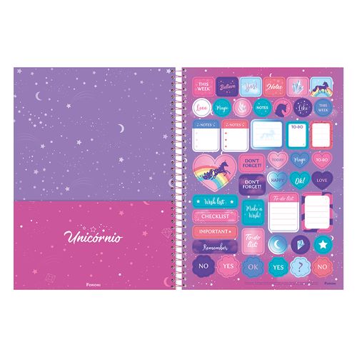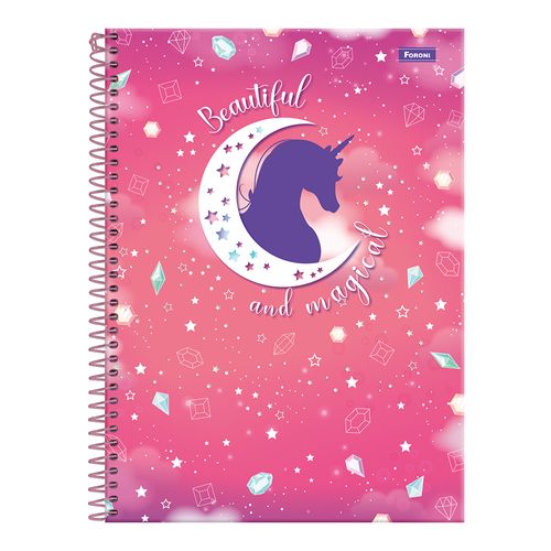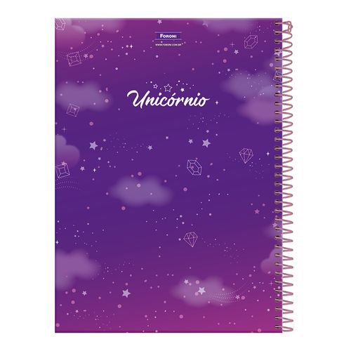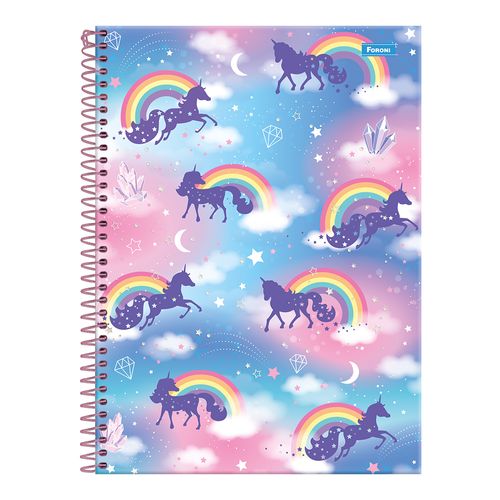 O Caderno Universitário Foroni Unicórnio é um item indispensável na escola, faculdade ou trabalho. São 10 matérias e 160 folhas, cap a dura com a parte interna decorada, bolsa de papel para guardar trabalhos e anotações, folha com adesivos funcionais, folhas pautad as e espiral.