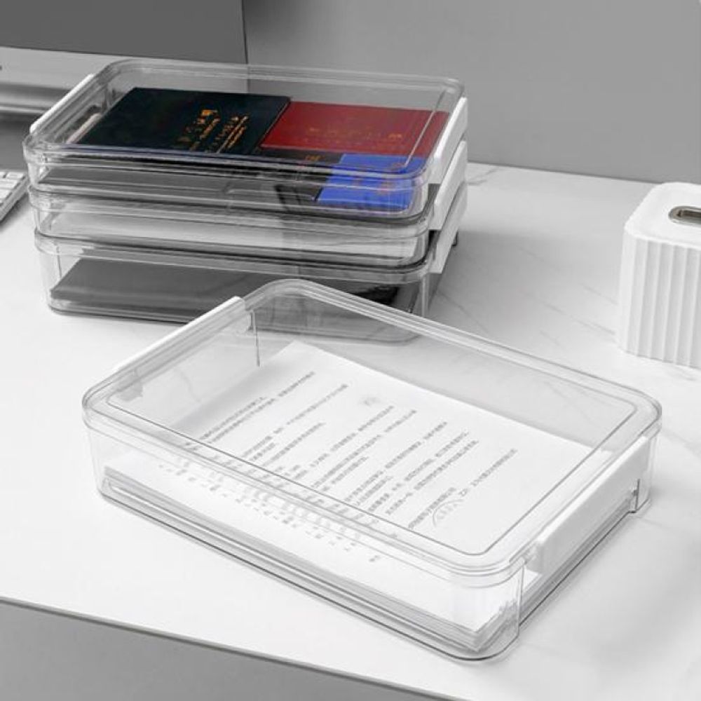 Apresentando a caixa organizadora, medindo 34*23,5cm, ideal para organizar documentos tamanho A4. O design empilhável garante estabilidade e armazenamento que economiza espaço.