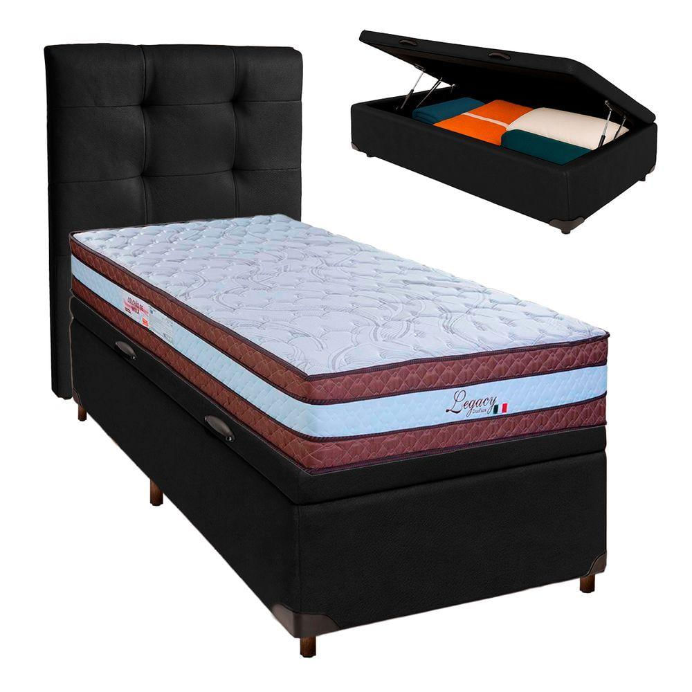 Cama + Bau Preto E Colchão Molas Ensacadas Solteiro - Legaccy Paropas + Cabeceira
