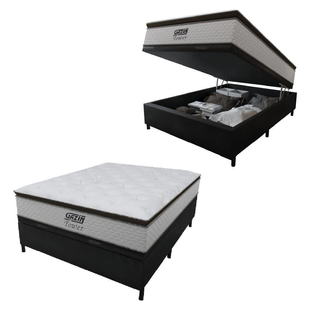 Cama Box Baú Casal Colchão Molas Pocket Ensacadas Tower 138x188x75cm Branco/preto Gazin Branco/pre