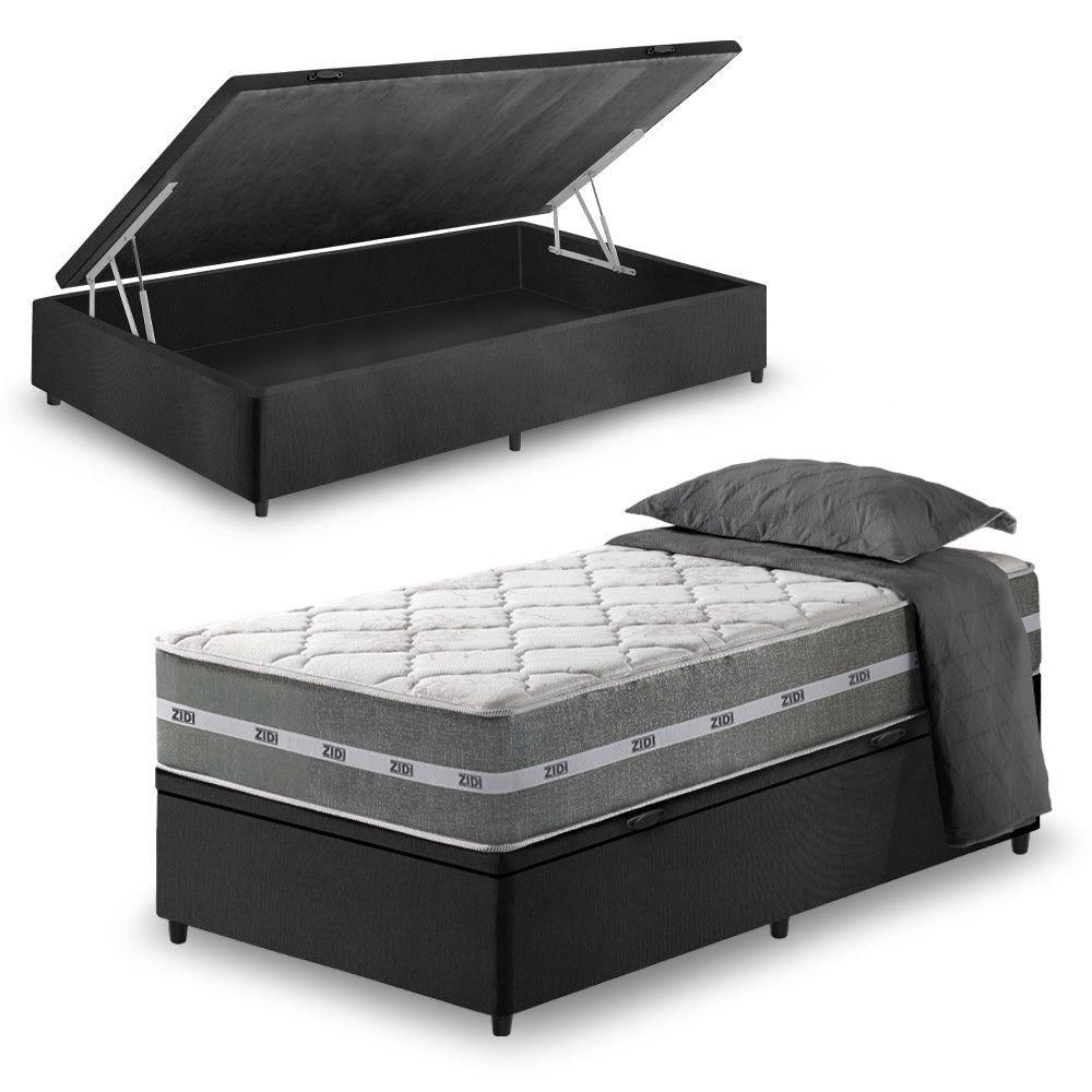 Cama Baú Solteiro Preto + Colchão Molas Ensacadas Miami Cinza Com Preto