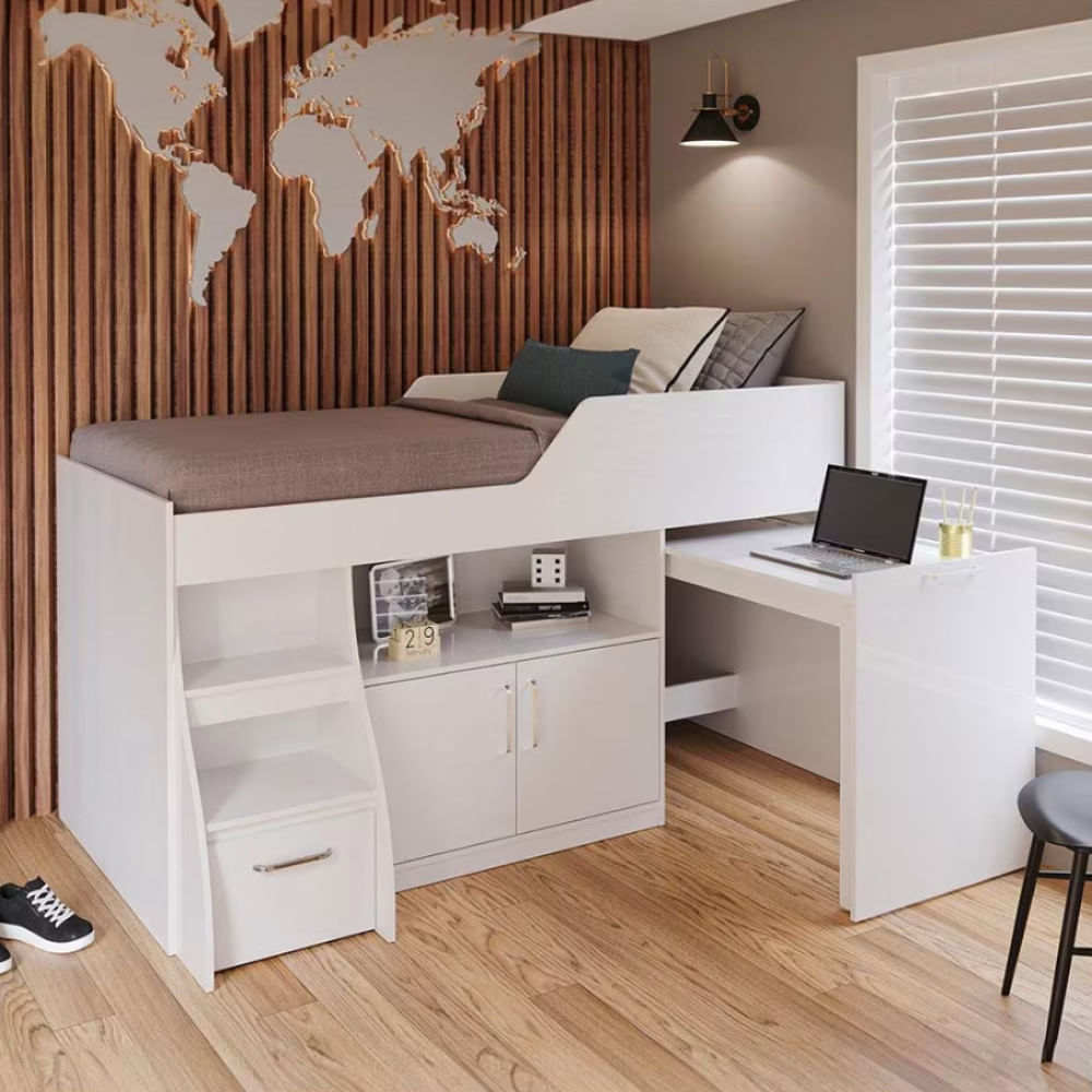 Cama de Solteiro Multifuncional Cimol Stela com Grade de Proteção Armário Gavetão Mesa Retrátil Branco