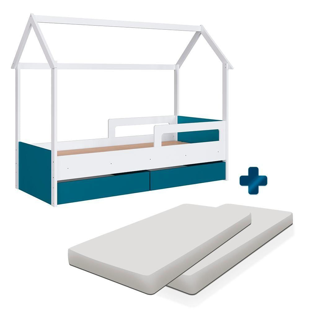 Cama Infantil Solteiro Com Colchão 2 Gavetas Casinha Branco Azul Secreto Carrossel Shop Jm