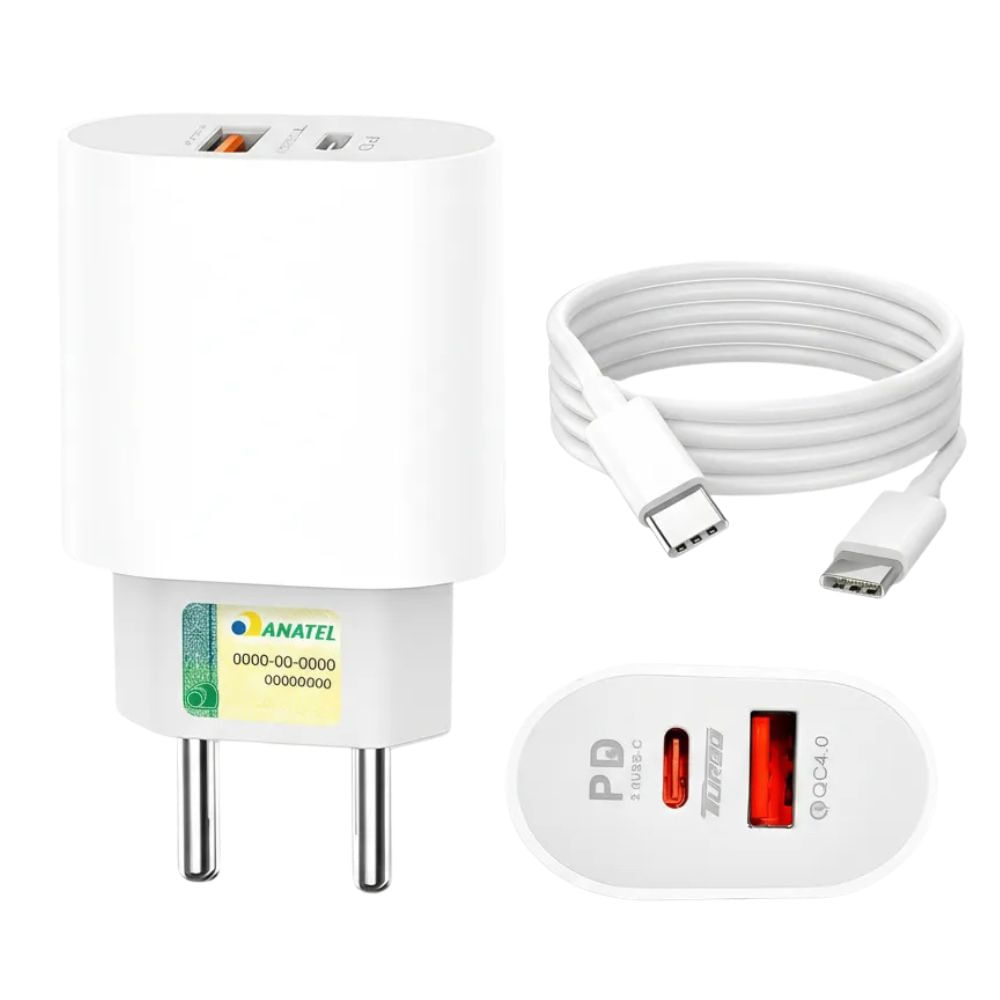 Código Anatel: 072062413363. Carregador duplo de 25W com padrão Type-C que revoluciona a forma como você carrega seus aparelhos. Com duas portas USB independentes, você pode carregar dois dispositivos simultaneamente mantendo a velocidade de carregamento otimizada. O design branco e minimalista combina com qualquer decoração. Possui proteção contra superaquecimento, curto-circuito e sobrecarga, garantindo a vida útil de seus equipamentos. Acompanha cabo Type-C de qualidade premium. Recomendado para usuários que precisam de eficiência e praticidade.