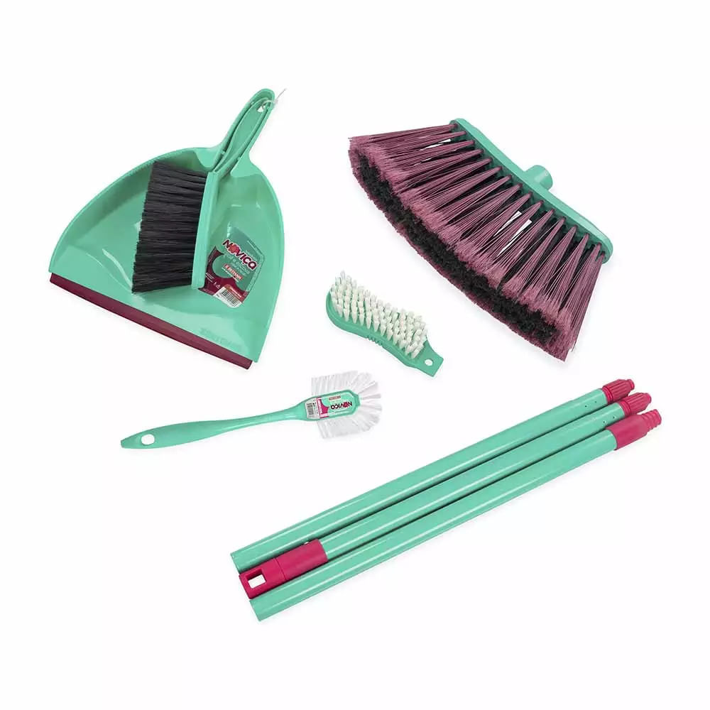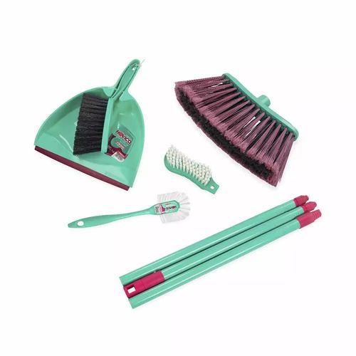 Contém: 1 Vassoura, 1 Pá, 1 Escova com cabo, 1 Escova multiuso e 1 Escova longo alcance.