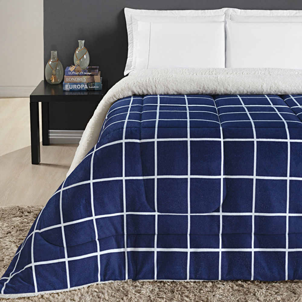 - Coberdrom Cobertor Brooklyn Solteiro Sherpa Manta Flannel Quadriculado - Azul Marinho