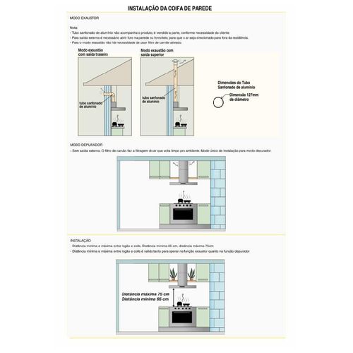 Duto dividido em superior e inferior com regulagem de altura. mín 68 cm e máx 100 cm já considerando a altura da base da coifa