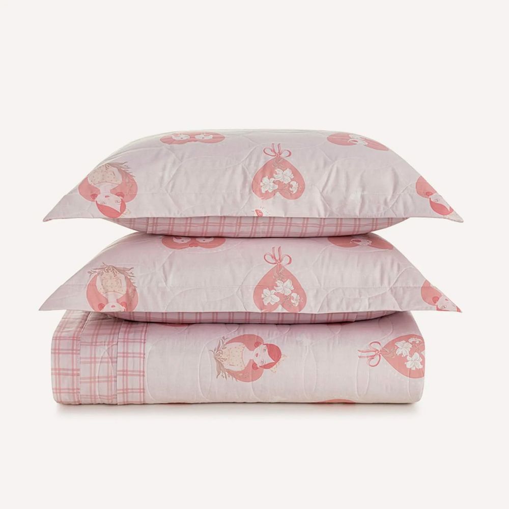 O jogo de colcha com porta-travesseiro Ameli encanta pela suavidade e riqueza de detalhes. De um lado, a imagem delicada da menina com seu passarinho e corações floridos; do outro, a clássica estampa xadrez rosa, que confere versatilidade à composição. O porta-travesseiro acompanha o conjunto com estampa coordenada e acabamento refinado. Ideal para transformar o quarto em um espaço acolhedor e afetuoso, o conjunto une charme, conforto e uma dose extra de ternura. Colcha: 2,20m x 2,60m; Porta-travesseiro: 50cm x 70cm. Coleção Despertar, com fundo rosa e quadriculado em tons mais fortes e porta-travesseiros com estampas de corações, pássaros e meninas em diferentes tons de rosa.