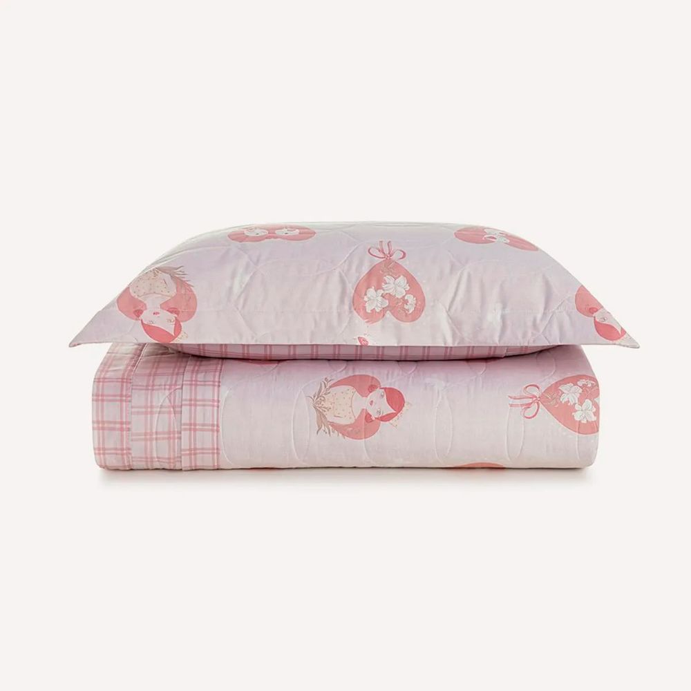 O jogo de colcha com porta-travesseiro Ameli encanta pela suavidade e riqueza de detalhes. De um lado, a imagem delicada da menina com seu passarinho e corações floridos; do outro, a clássica estampa xadrez rosa, que confere versatilidade à composição. O porta-travesseiro acompanha o conjunto com estampa coordenada e acabamento refinado. Ideal para transformar o quarto em um espaço acolhedor e afetuoso, o conjunto une charme, conforto e uma dose extra de ternura.