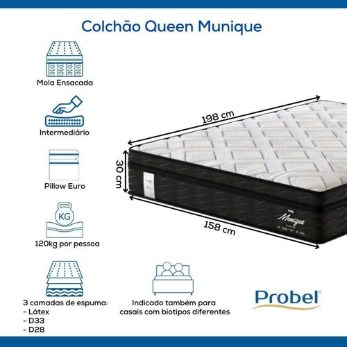 Colchão Queen Mola Ensacada Probel Munique: O Toque de Sofisticação e Conforto que Você Merece Descubra o Colchão Mola Ensacada Probel Munique. Perfeito para casais que valorizam conforto e qualidade, o Colchão Probel Munique oferece suporte personalizado e superfície acolhedora para noites de sono tranquilas e revigorantes. Características Principais:Modelo: MuniqueMarca: ProbelPillow: EuroTecido Tampo: Malha Branca com detalhes na cor BegeGramatura Tecido: 280 g/m²Espuma Matelassê: D20 CilíndricaEspuma do Estofamento 1: LátexEspuma do Estofamento 2: D33Sistema de Molejo: Mola EnsacadaIndicação Biotipos Casais: Indicado também para casais com biotipos diferentesBase de Suporte do Colchão: EspumaNível de Firmeza: IntermediárioAltura: 30 cmSuporte de peso: 120 Kg por pessoaManutenção: No turnGarantia: 12 MesesCertificação Inmetro: Certificado conforme Portaria Inmetro Nº 75/2021Largura: 158 cmComprimento: 198 cmTamanho: Queen Benefícios do Colchão Probel Munique:- Conforto Luxuoso com Pillow Euro: O pillow euro proporciona uma superfície incrivelmente macia e acolhedora. O tecido de malha branca com detalhes na cor bege e gramatura de 280 g/m² oferece a sensação de frescor e suavidade ao toque, ideal para noites de sono tranquilas.- Suporte Personalizado e Independente: O sistema de molas ensacadas individualmente garante suporte personalizado e se adapta aos contornos do corpo para proporcionar o alinhamento perfeito da coluna. Isso é especialmente benéfico para casais com biotipos diferentes, pois minimiza a transferência de movimento, permitindo que cada pessoa tenha uma noite de sono ininterrupta.Saúde e Bem-Estar: A composição do Colchão Probel Munique promove a postura correta durante o sono, aliviando pontos de pressão e prevenindo dores e desconfortos. Isso resulta na melhora significativa da qualidade do sono, refletindo positivamente na saúde e no bem-estar geral. Garantia e Suporte: A Probel oferece garantia de 12 meses, reafirmando seu compromisso com a qualidade e a satisfação do cliente. Em caso de qualquer defeito de fabricação, a assistência técnica premiada da Probel está pronta para atender rapidamente. A qualidade consistente e a superioridade tecnológica do Colchão Probel Munique inspiram confiança e confiabilidade, características que fazem da Probel uma referência no mercado. Com um design sofisticado e materiais de alta qualidade, este colchão é a escolha ideal para quem busca exclusividade, sofisticação e um valor tangível em cada detalhe. Transforme suas noites e dias com o Colchão Mola Ensacada Probel Munique. Experimente o poder revigorante de um sono de qualidade e sinta a diferença em sua saúde, humor e produtividade diária. Para uma vida mais pró, escolha Probel. Pillow: Euro