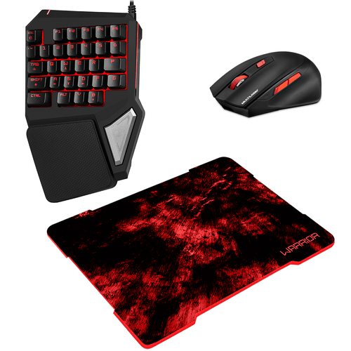 Combo Gamer, os melhores produtos para o momento mais divertido do seu dia. O Teclado One Hand da Warrior veio para inovar a linha Gamer do mercado!Foi desenvolvido ergonomicamente para facilitar a utilização do jogador, deixando as funções mais importantes próximas, de forma compacta e principalmente pensando no conforto durante a utilização. Seu SOFTWARE É INCLUSO para opção de customização de macros e diversos modos de luz para que o jogador escolha entre múltiplos efeitos, como iluminação imersiva ou estática.SEMI MECÂNICO para maior precisão e desempenho durante as suas partidas nos jogos. Conector USB banhado a ouro, cabo 1,75 metros com malha de nylon.Mouse pad envolvido por um material flexível que pode ser dobrado sem que sua estrutura seja danificada.Mouse Gamer MO295 é um produto com design para o público gamer, garantindo a agilidade e qualidade para jogar qualquer tipo de game. O produto é sem fio com bateria de Lithium, onde há a possibilidade de usar o mouse com fio enquanto ele carrega. Possui 6 botões e a sensibilidade de 2400 DPI (com 5 níveis).Imagens meramente ilustrativas.