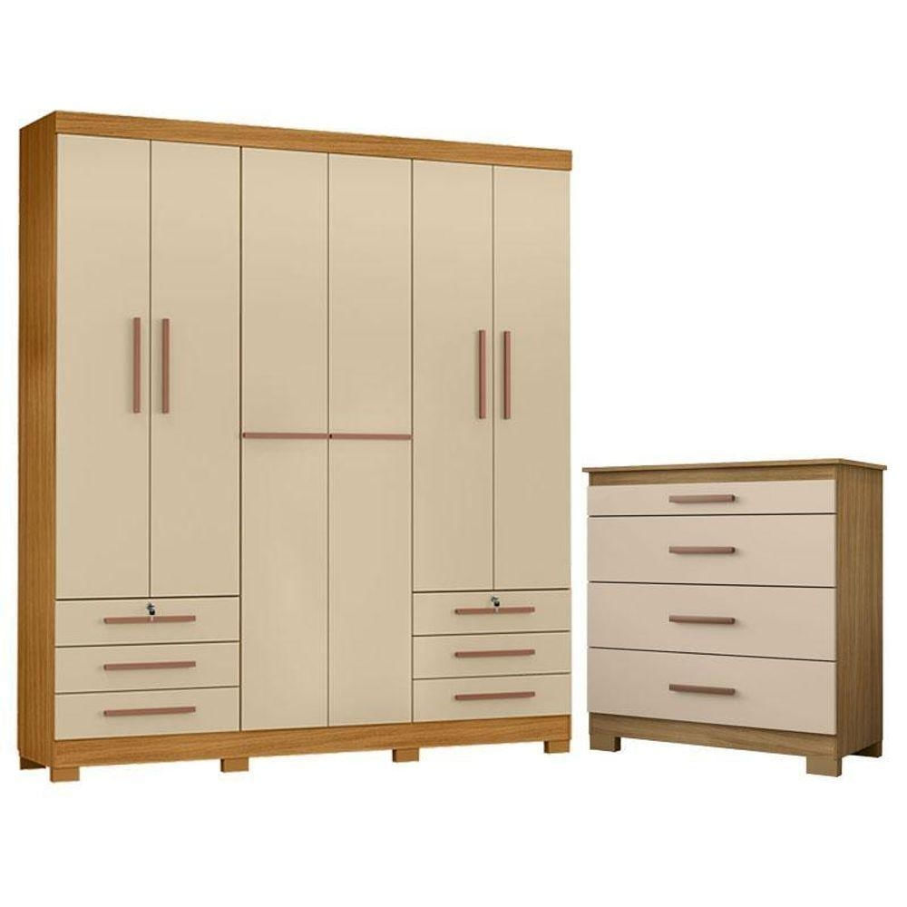 Cômoda 4 Gavetas New E Guarda Roupa Casal Londres Carvalho Americano Off White - Incorplac