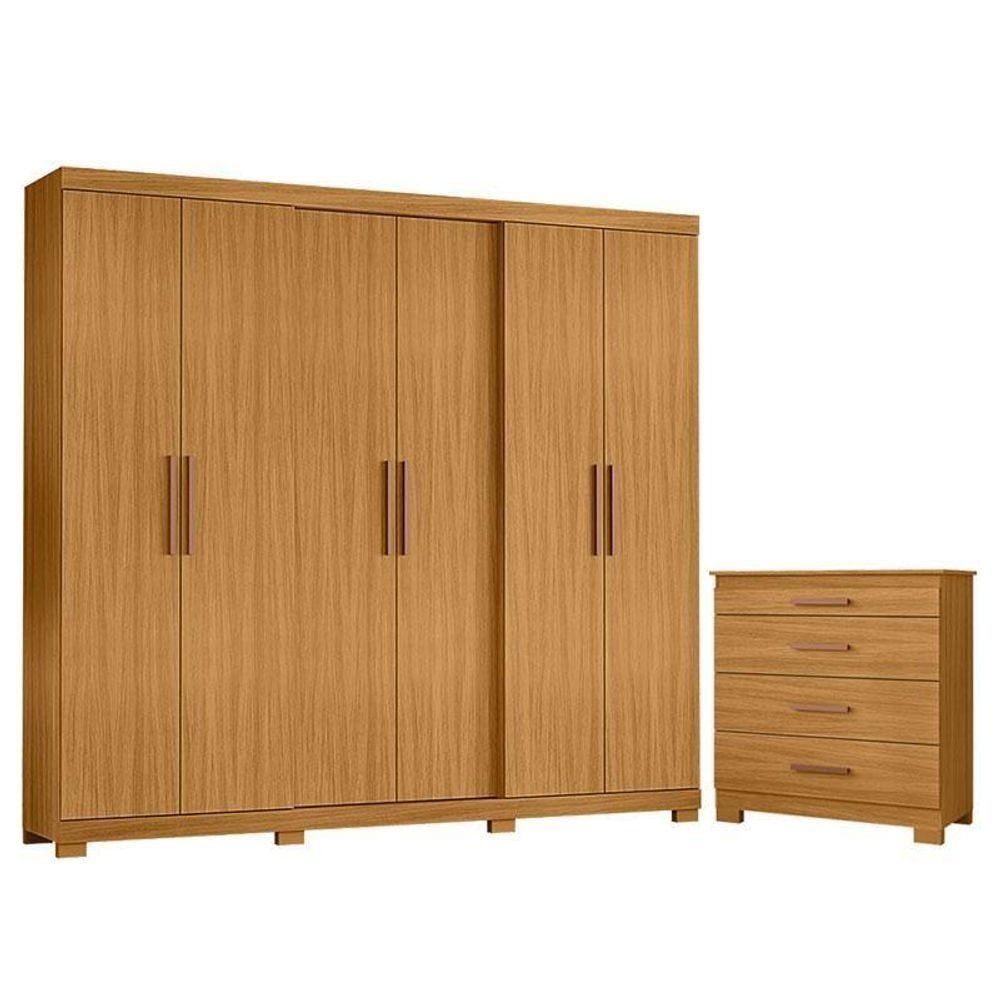 Cômoda 4 Gavetas New e Guarda Roupa Casal San Diego Carvalho Americano TX – IncorplacTransforme seu quarto com estilo com nosso Guarda Roupa da linha San Diego, e a Cômoda New. Desenvolvidos pela Incorplac fabricados com materiais de alta qualidade em MDP com um lindo design moderno. O guarda roupa possui amplo espaço interno gavetas equipadas com corrediças telescópicas trazendo suavidade ao abrir e fechar. A cômoda oferece espaço extra para acomodar seu itens de forma organizada. Venha aproveitar garanta já o seu! Cômoda 4 Gavetas New Carvalho Americano TX – Incorplac Características Técnicas: - Desenvolvida em MDP - Acabamento em Pintura UV – com acabamento TX (sensível ao toque) - O produto possui 01 gaveta menor com divisórias de hdf 0,3 cm para criar um organizador de jóias/maquiagem e espaço para guardar escovas, secadores, pranchas e afins - 04 gavetas com corrediças telescópicas - 04 Pés Plásticos com 5 cm, para elevação do produto e proteção - Lindo Design Dimensões: Altura: 92,5 cm Largura: 90,4 cm Profundidade: 40 cmGuarda Roupa Casal San Diego Carvalho Americano TX - Incorplac Características Técnicas: - Desenvolvido 100% em MDP; - Acabamento em Pintura UV com textura TX (sensível ao toque) - Amplo espaço interno para armazenamento das roupas - Diversas divisões internas e maleiro superior - 06 portas com dobradiças metálicas de 26 mm - 02 portas centrais recuadas, proporcionando design moderno - 04 gavetas com corrediças telescópicas - 06 puxadores em ABS, garantindo visual moderno e pegada confortável - 02 cabideiros em alumínio, oferecendo resistência e suporte adequado - 03 prateleiras centrais (02 fixas e 01 removível) para melhor organização - 08 pés plásticos com 5 cm de altura, garantindo estabilidade e proteção ao piso Dimensões: Altura: 234,5 cm Largura: 240 cm Profundidade: 47 cm Informações importantes: - Não acompanha decorações e acessórios - Nossas cargas possuem seguro, portanto, no ato da entrega, confira a quantidade de volumes recebida, e também o estado da embalagem. Se houver qualquer inconsistência, não assine o comprovante de entrega; - O armazenamento do produto no endereço de entrega é de responsabilidade do comprador. Evite apoiar o produto na vertical, bem como evite áreas que deixem o produto exposto a chuva ou umidade excessiva; - Pequenas variações de tonalidade são possíveis, em razão da diferença de resolução da tela onde o anúncio está sendo visualizado. Se notar diferença expressiva, comunicar a empresa antes de efetuar a montagem; - O serviço de entrega contratado contempla a entrega até a primeira área coberta ou portaria, não sendo coberto o ato de subir escadas/elevadores ou adentrar nas residências; - Não nos responsabilizamos pela montagem, desmontagem ou instalação do produto. NA