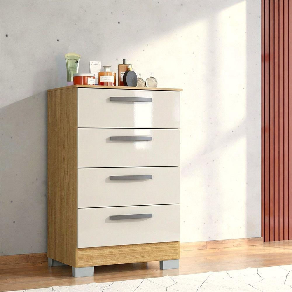 Produto: Comoda Modelo: Alice Marca: Poquema Quantidade de gavetas: 04 Material: MDP 12 mm Cor: Branco Corredicas: Metalicas Puxadores: Plastico na cor prata Pes: Plastico na cor cinza Acabamento: Pintura U.V. Uso indicado: Quarto, closet e ambientes residenciais Necessita montagem: Sim