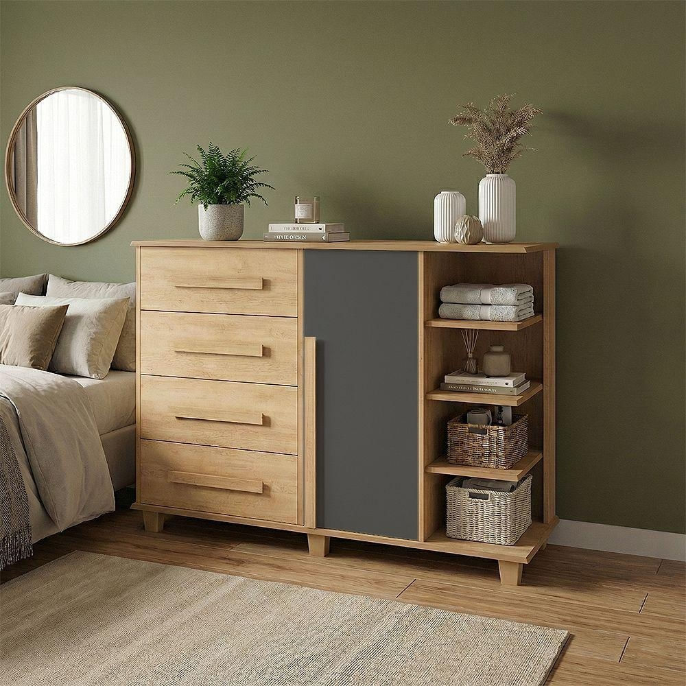 Cômoda Andorra 4 Gavetas 1 Porta C/ Nichos Organizadora Quarto Bebê Infantil - Cinamomo/grafite