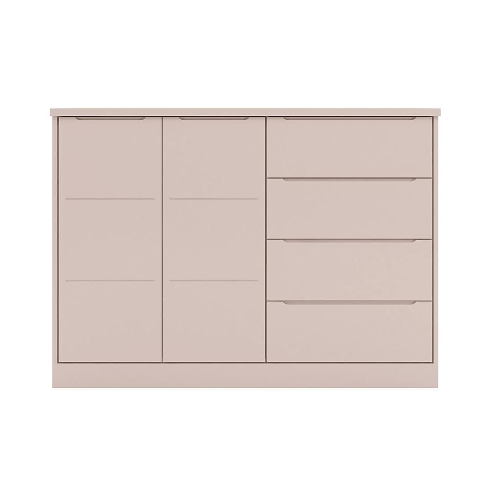 Características do Produto Material da Estrutura: 100% MDF 15mm. Peso suportado distribuído: 60 kg. Acabamento: Pintura UV. Escala de Brilho: Acetinado. Quantidade de Portas: 2 Portas. Tipo de Dobradiças: Metálicas. Tipo de Porta: Convencional. Quantidade de Gavetas: 4 Gavetas. Tipo de Corrediças: Telescópicas. Tipo de Puxador: Cava. Possui Prateleiras: Sim. Possui Pés: Não. Diferenciais: - Portas com dobradiças metálicas. - Gavetas com corrediças telescópicas. Sistema de Montagem: Minifix / Cavilhas / Parafusos. Manual de Montagem: Sim. Complexidade da Montagem: Média. Volumes: 2 Volumes. Conteúdo da embalagem: 1 Cômoda. Garantia do Fabricante: 90 dias contra defeito de fabricação. Montagem: Recomendamos que seja feita por um profissional. Recomendação de Limpeza: Pano levemente úmido e detergente neutro.