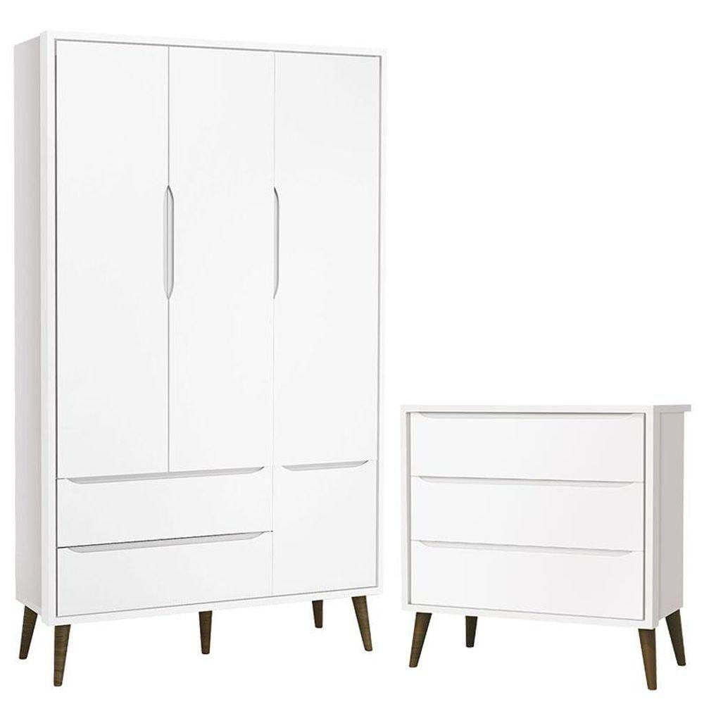 Cômoda Infantil Gaveteiro E Guarda Roupa 3 Portas Theo Branco Acetinado Com Pés Amadeirado - Reller