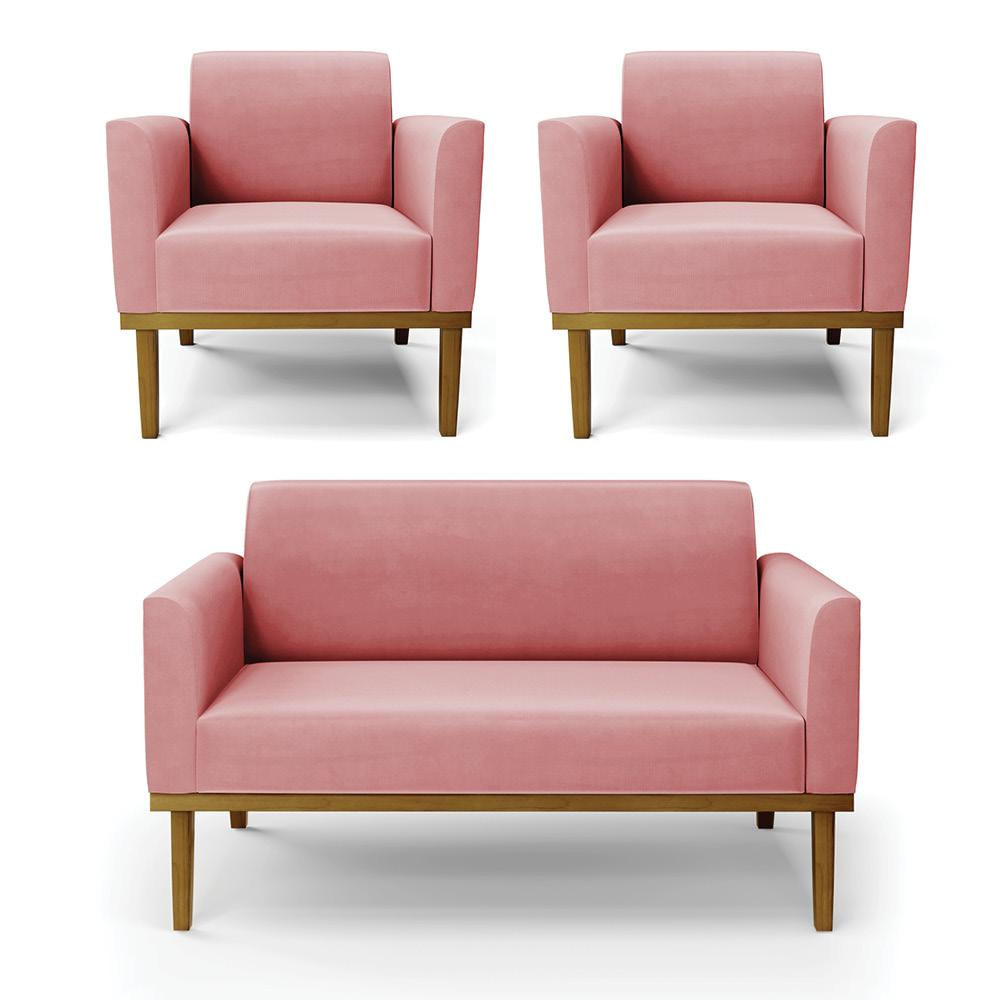Conjunto 2 Poltronas e 1 Namoradeira Decorativa Isabella Pés Fixo em Madeira Castanho Suede Rose G19 - Gran Belo