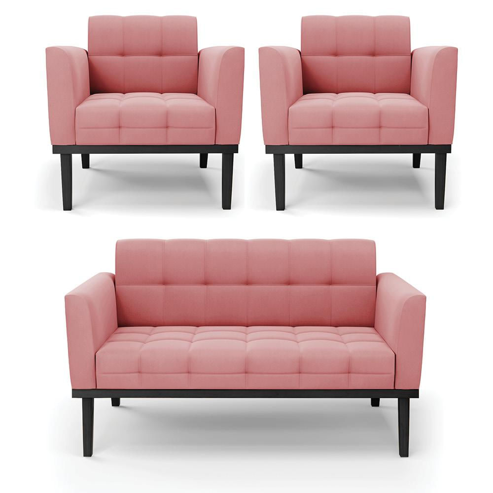 Conjunto 2 Poltronas e 1 Namoradeira Decorativa Karen Pés Fixo em Madeira Preto Suede Rose G19 - Gran Belo