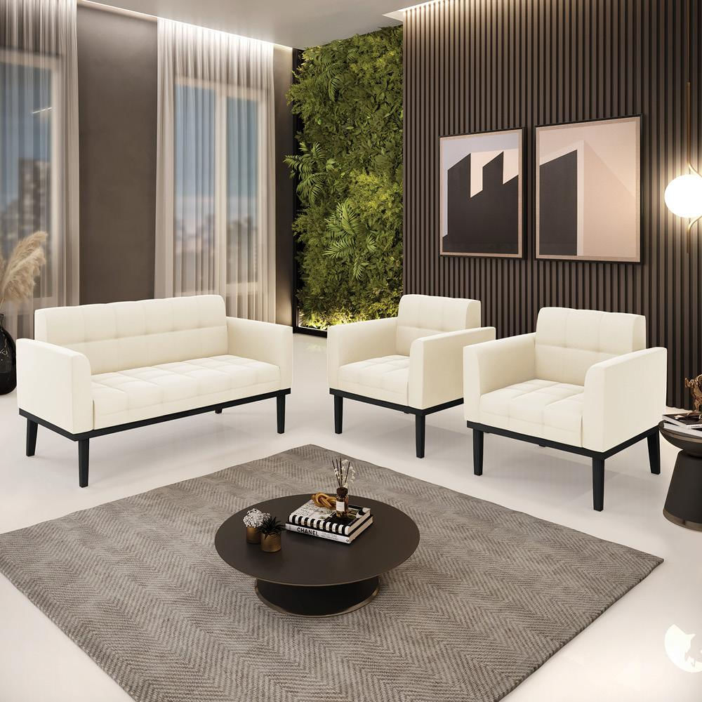 Conjunto 2 Poltronas e 1 Namoradeira Decorativa Karen Pés Fixo em Madeira Preto Veludo Bege G19 - Gran Belo