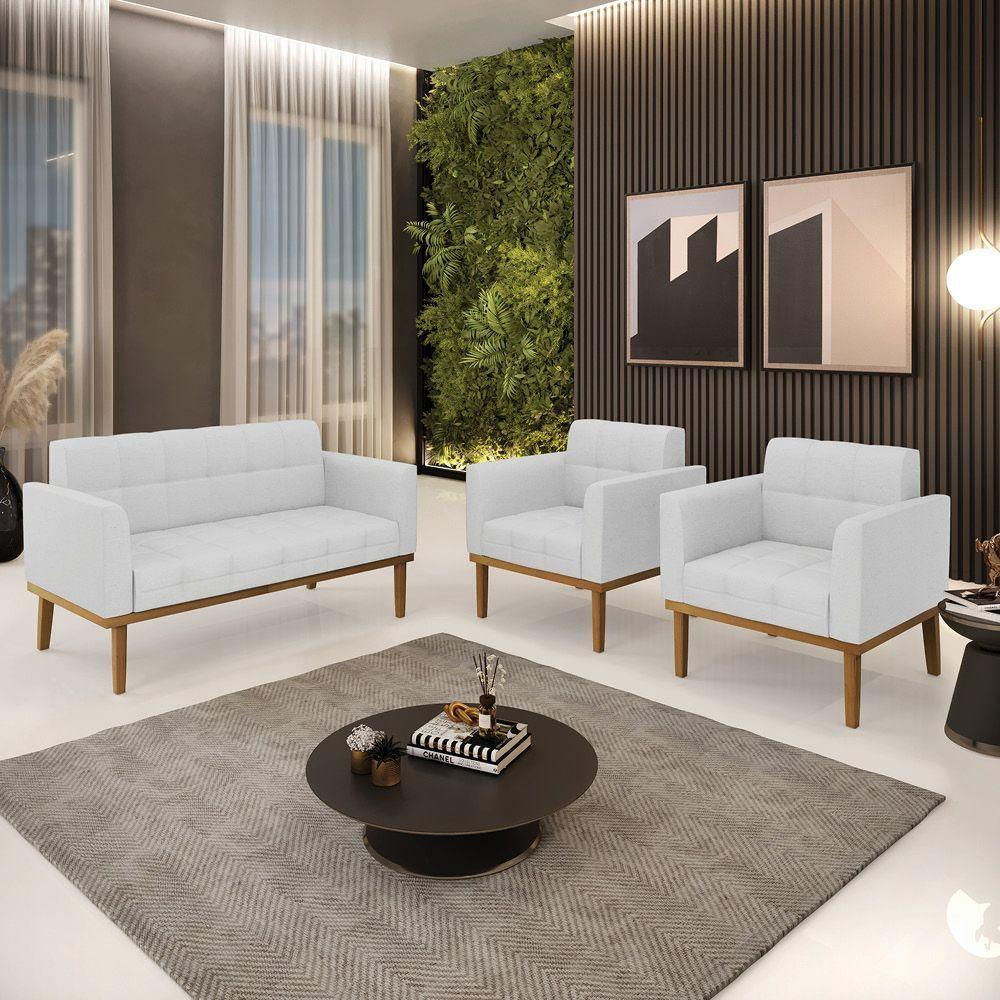 Conjunto 2 Poltronas E 1 Namoradeira Decorativa Pés Fixo Em Madeira Castanho Linho Cinza