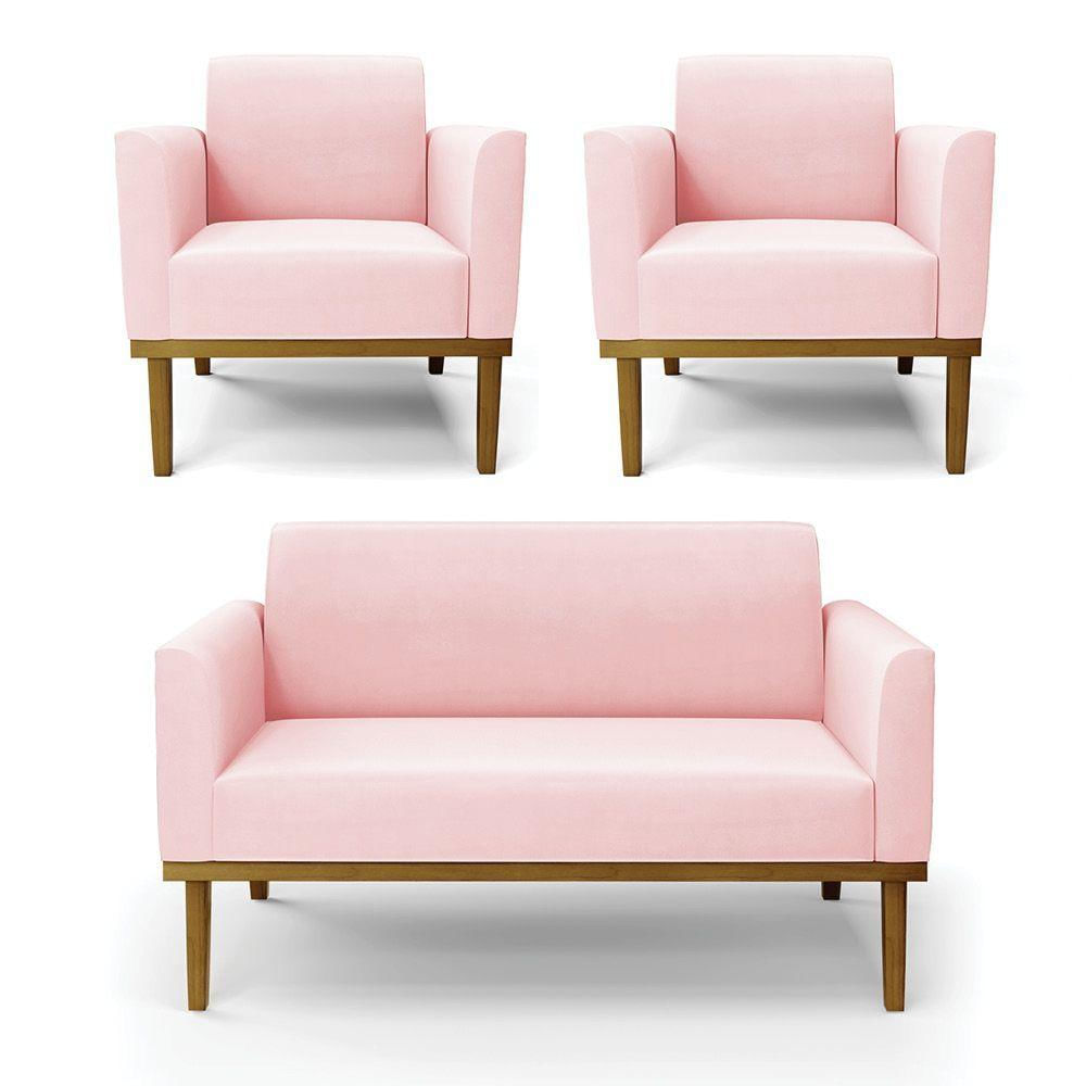 Conjunto 2 Poltronas E 1 Namoradeira Decorativa Pés Fixo Em Madeira Castanho Suede Rosa Bebê
