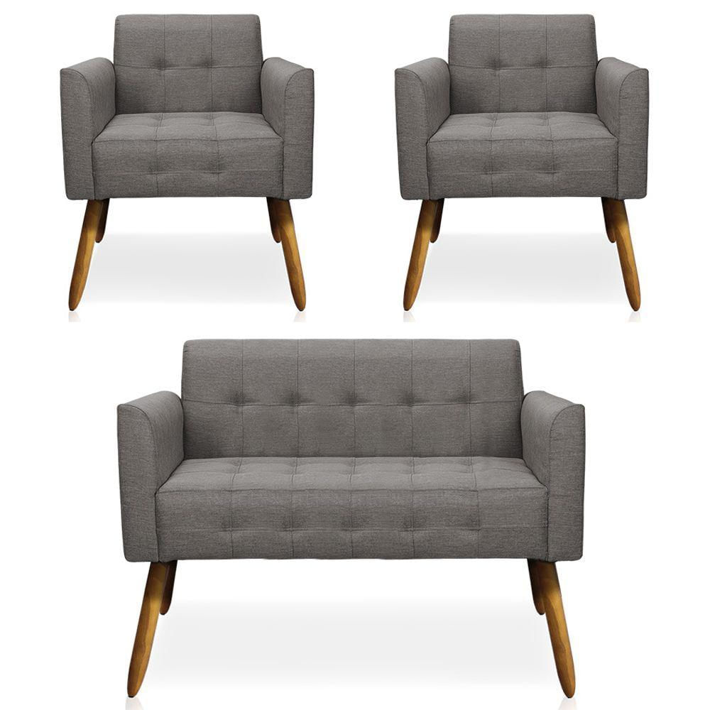 Conjunto 2 Poltronas E 1 Namoradeira Pés Palito Karen Linho Grafite - Gran Belo