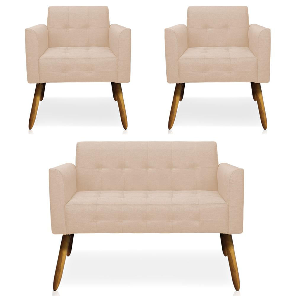 Conjunto 2 Poltronas e 1 Namoradeira Pés Palito Karen Linho Bege - Gran Belo