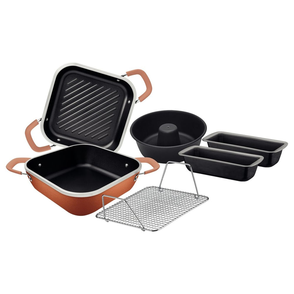 CONJUNTO 6 PEÇAS TRAMONTINA LYON 3 FORMA 1 CAÇAROLA 1 GRELHA ALUMÍNIO FORJADO ANTIADERENTE DOURADO ALÇA BEGE 20998/453