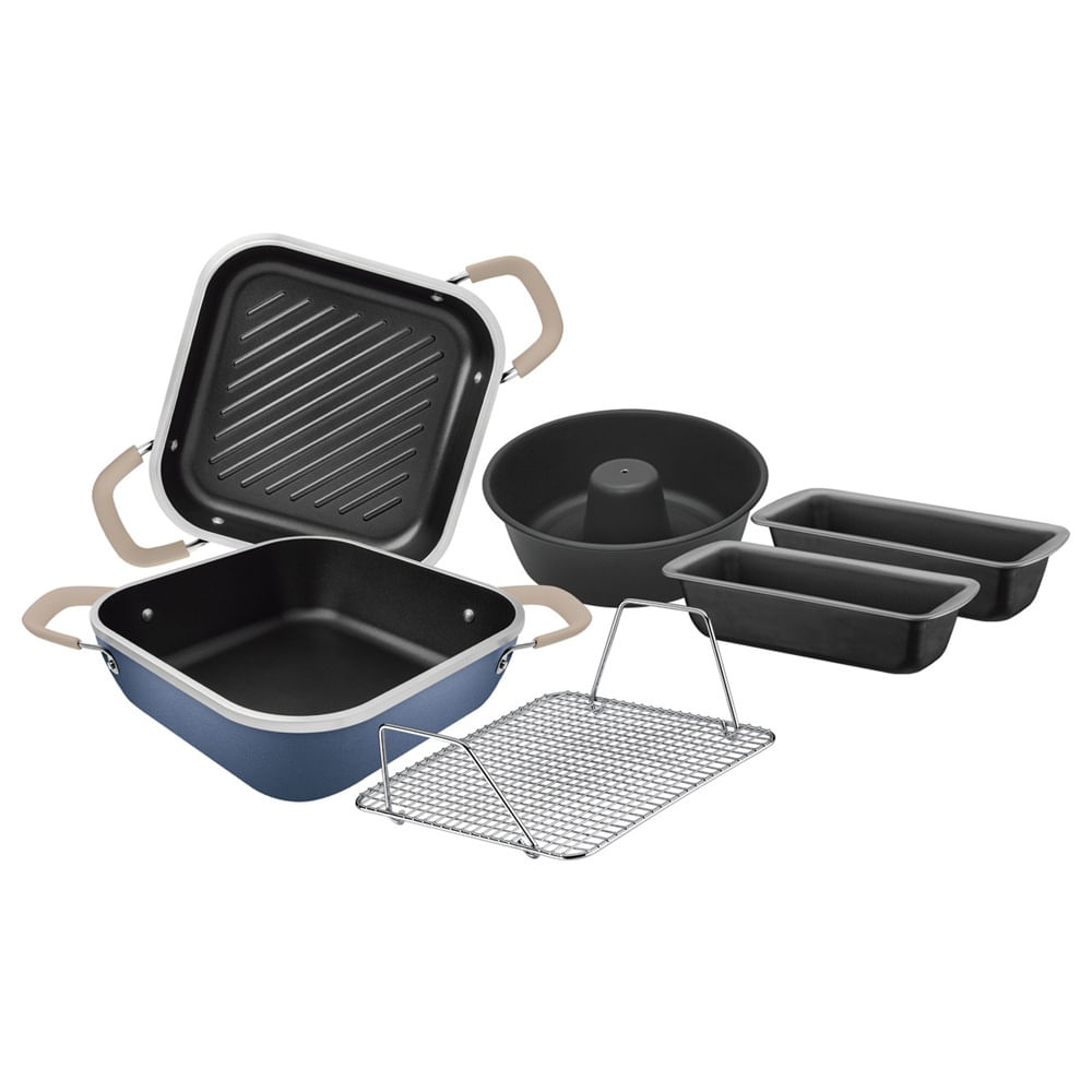 CONJUNTO 6 PEÇAS TRAMONTINA LYON FORMA CAÇAROLA GRELHA ALUMÍNIO FORJADO ANTIADERENTE AZUL ELEMENTAR ALÇA BEGE 20998/853