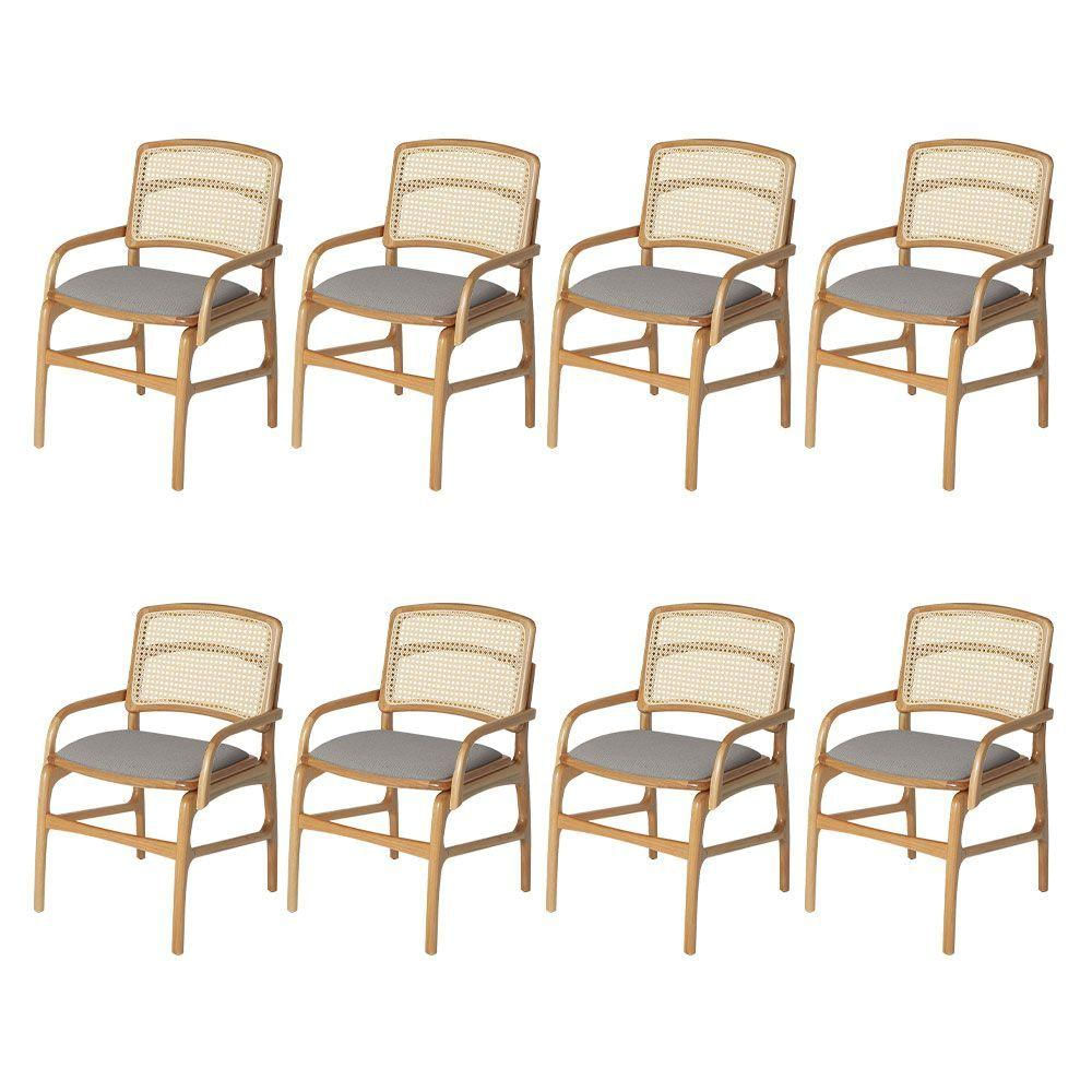 Conjunto 8 Cadeiras De Cozinha Florença Em Madeira Jequitibá Natural Braço Encosto Palha Linho Cinza