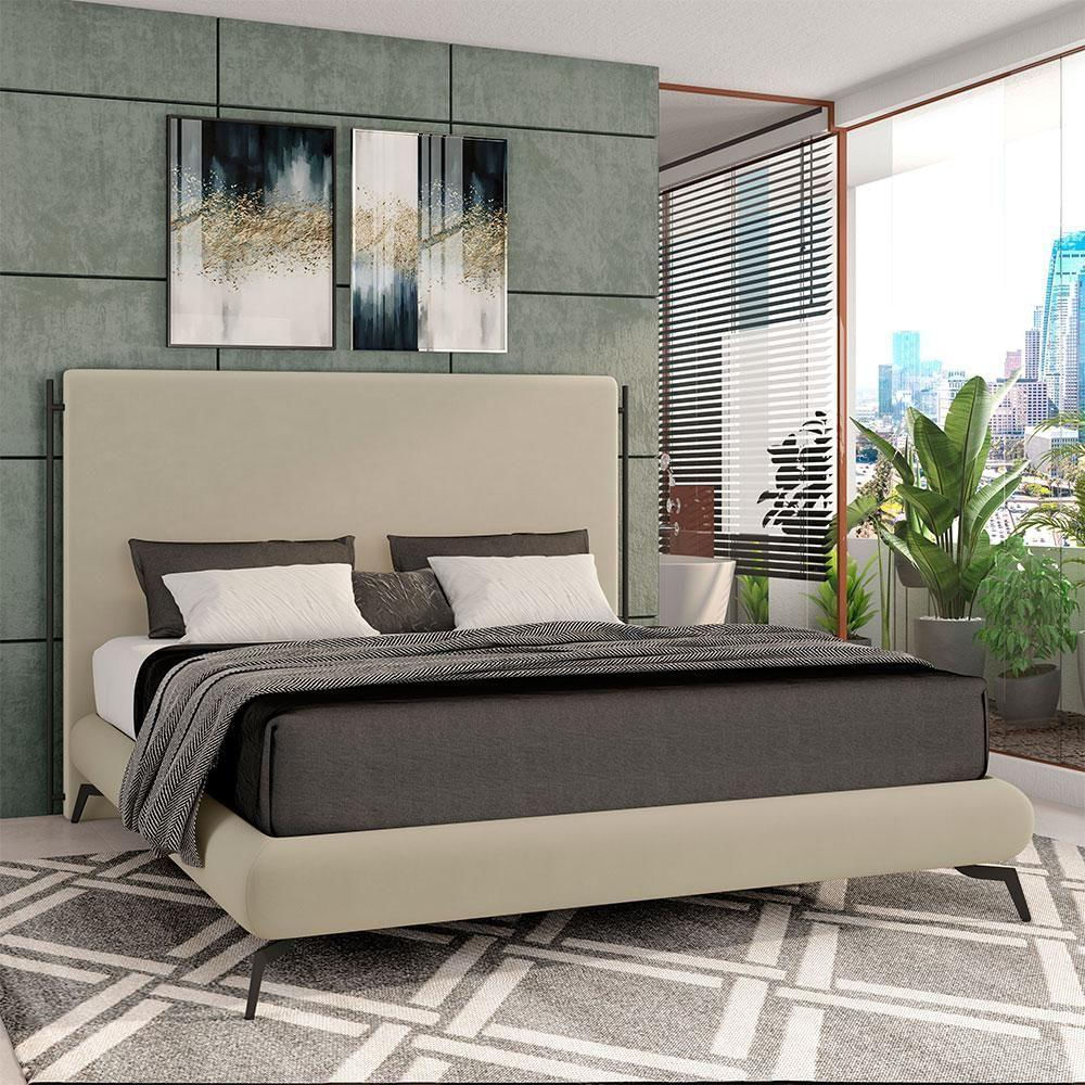 Conjunto Cabeceira E Base Para Colchão Casal Bezos Com Pés Em Alumínio Veludo Bege G91 - Gran Belo