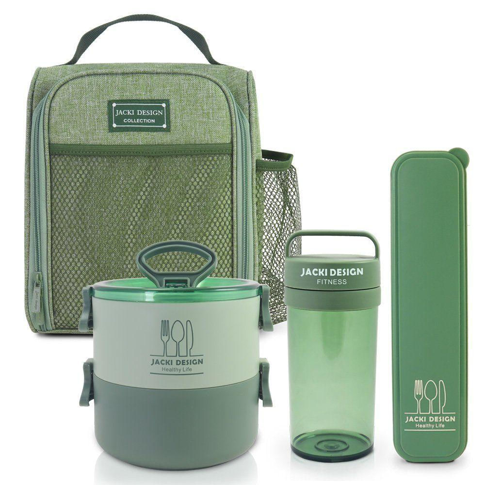 Conjunto da Linha Joy com Bolsa térmica, Porta talher, Pote de Marmita 2 Andares e Garrafa 430ml Verde - Kit da linha Joy! Tenha uma vida mais saudável com estilo!Bolsa Térmica C/ Bolsos - Joy:A bolsa térmica da coleção JOY, foi criada pensando em oferecer mais praticidade e estilo para o consumidor moderno! A bolsa térmica é feita multicamadas e folha de alumínio para manter seu alimento fresco e conservado. Possui fecho em zíper, bolso externo para garrafa e alça de mão. É ideal para levar ao trabalho, academia ou viagens. Conheça a linha completa da coleção JOY e complete o seu kit!CUIDADOS GERAIS: Limpe a bolsa térmica com um pano úmido. Caso necessário, use sabão neutro ou álcool para higienizar o local. Deixe secar na sombra.ATENÇÃO: Para preservar a vida útil do produto, recomendamos não deixar a bolsa de molho, não levar a máquina de lavar e também não utilizar produtos químicos.Medidas: Comprimento: 19cm x Largura: 13cm x Altura: 24cmPorta Talheres Portátil:O Porta Talheres da Jacki Design é um item essencial para transportar com higiene e segurança seus talheres. Feita de material Polipropileno, ele é compacto e fácil de limpar. Conheça a linha completa da coleção JOY e complete o seu kit!Medidas: Comprimento: 25cm x Largura: 6cm x Altura: 3cmPote Marmita de 2 andares 1600 ml:Agora ficou mais fácil organizar seus alimentos para um dia longo. A marmita de 1400 ml possui 2 recipientes que encaixa um em cima do outro, acompanha garfo e é prático e simples. Feito de material polipropileno, é resistente e possui tampa com travas para segurança evitando acidentes. Produto livre de BPA com qualidade Jacki Design. Conheça a linha completa da coleção JOY e complete o seu kit! (INSTRUÇÕES DE USO: Retire a tampa antes de levar ao micro-ondas; usar somente para aquecer comida, não para cozinhar; Vai ao freezer e lava-louças; Temperatura de uso: -20°C ~120°C; Limpe usando uma esponja macia e detergente.)Medidas: Comprimento: 16cm x Largura: 14cm x Altura: 14cmGarrafa 430 ml:O copo transparente de 430 ml é ideal para levar água, suco ou chá para o escritório ou escola. Possui um filtro infusor, fecho colorido e alça de mão. É leve e fácil de carregar. Produto com qualidade Jacki Design. Conheça a linha completa da coleção JOY e complete o seu kit! (INSTRUÇÕES DE USO: Não vai ao micro-ondas ou lava-louças; Temperatura de uso: -20°C ~80°C; Limpe usando uma esponja macia e detergente).Medidas: Comprimento: 7.5cm x Largura: 7.5cm x Altura: 17.5cm