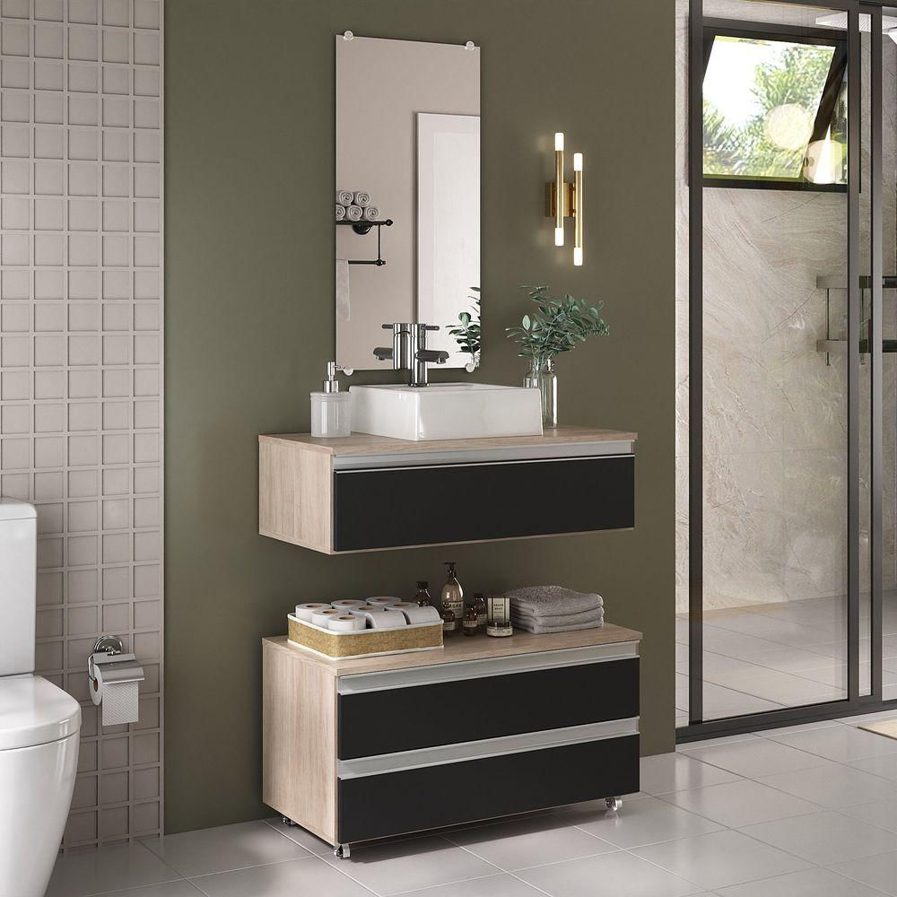 Conjunto De Gabinete Banheiro Creta 80cm (gabinete+cuba+espelheira) Madeirado Preto