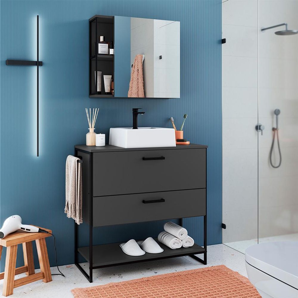 Conjunto de Gabinete de Banheiro Paricel 1 PT e 1 GV com Cuba Ametista Branca e Espelheira Angel 1 PT Preto e Grafite