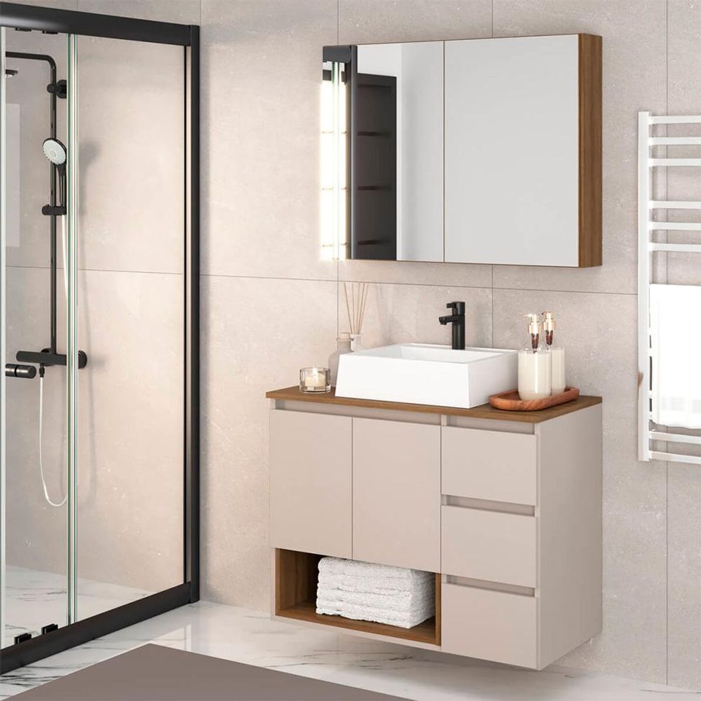 Conjunto de Gabinete Suspenso com Cuba Vitória e Armário de Banheiro Aurora 4 Portas 3 Gavetas Mel e Arenas