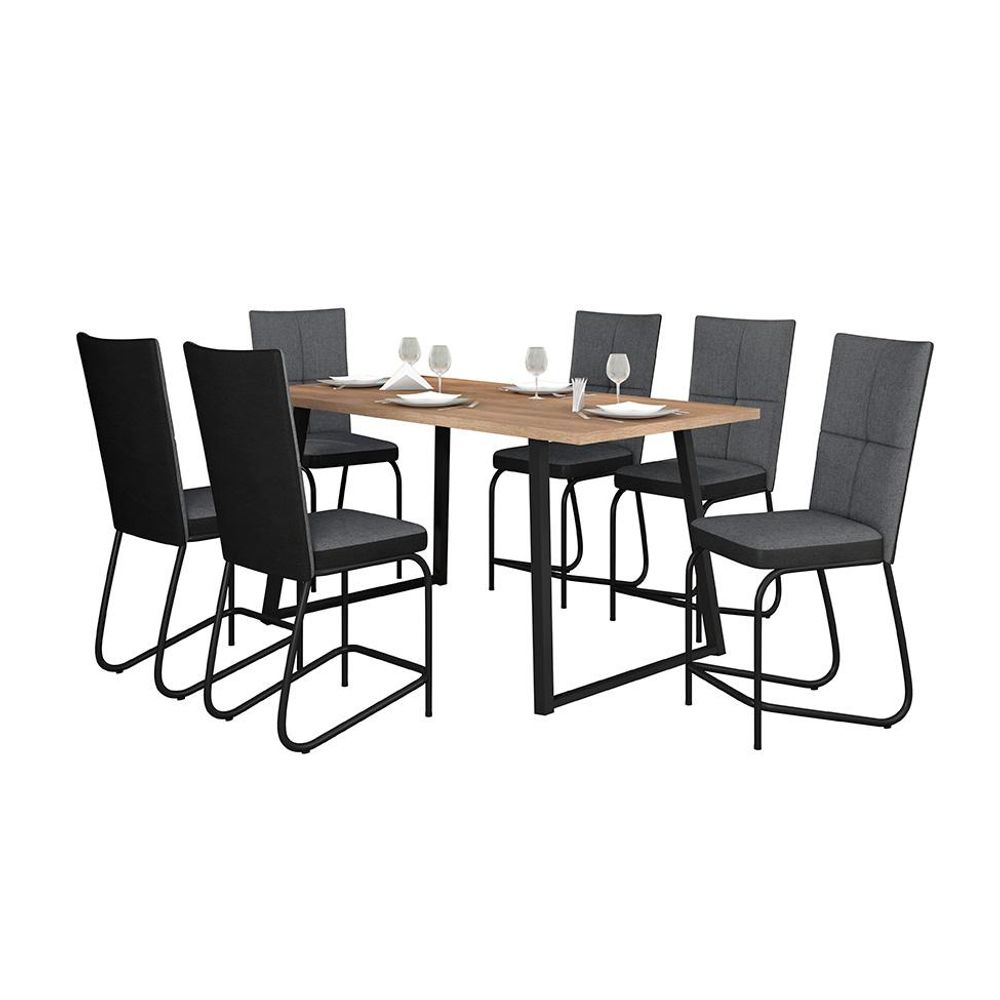 Conjunto de Mesa Retangular com Tampo de MDP Amadeirado Atlanta e 6 Cadeiras Mônaco Revestimento Sintético Cinza e Preto