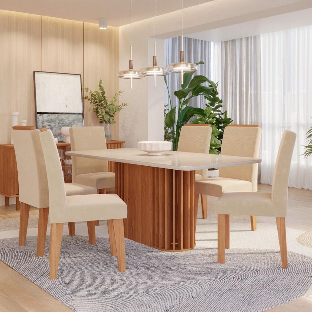 Conjunto de Mesa Retangular com Tampo de Vidro Off White Julieta e 6 Cadeiras Tais e Maia Suede Bege e Amadeirado