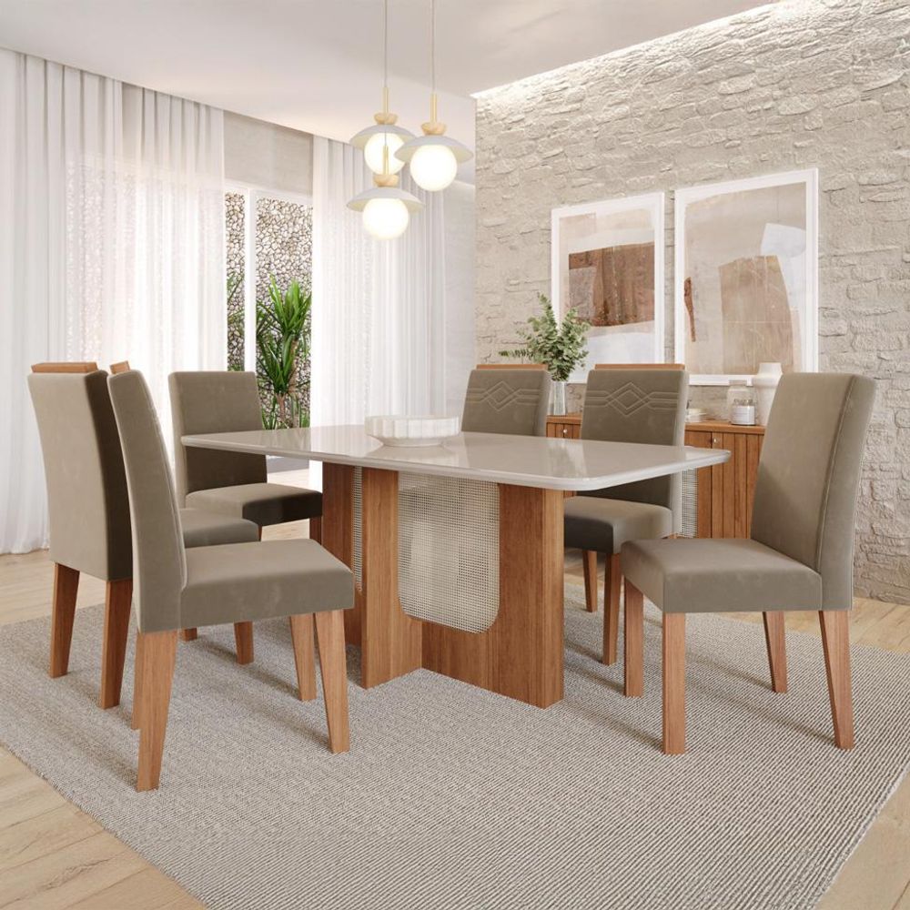 Conjunto de Mesa Retangular com Tampo de Vidro Off White Louise e 6 Cadeiras Tais e Maia Suede Joli e Amadeirado